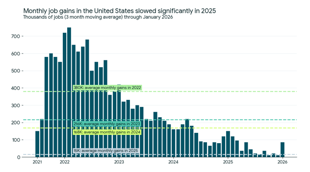 The U.S. labor market continued to reflect a “low-hire, low-fire” dynamic throughout the quarter. The unemployment rate edged back up to 4.4%, approaching the four-year high of 4.5% reached in November 2025. Nonfarm payrolls fell by 92,000 in February, well below expectations of a 59,000 gain. The result was compounded by downward revisions to prior months, including a revision to December that flipped the prior 48,000 job gains to a loss of 17,000, bringing average monthly gains for 2025 down to just 15,000.