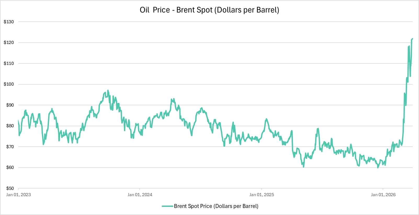 Commodities were extremely volatile during the quarter, highlighted by a surge in oil prices that saw Brent crude prices rising as high as $117 per barrel after starting the year at just under $61. While Iran is vastly overpowered in the fight against the combined military might of the US and Israel, it holds a strategic geographic advantage over the Strait of Hormuz. Iran attacked several tankers in the strait, and the continued threat of hostilities has forced oil tankers to either stop traveling through the waterway or pay a toll of up to $2 million per ship to the Iranian regime for safe passage. While President Trump has recently stated he is willing to walk away without retaking the Strait of Hormuz, a resolution is desperately needed to prevent global energy prices from rising even higher. Outside of oil, other commodities also swung wildly during the quarter, highlighted by gold prices, which surged to a record peak of $5,595/oz on January 28th before falling as low as $4,100/oz in late March. Gold ended the quarter at roughly $4,500/oz.